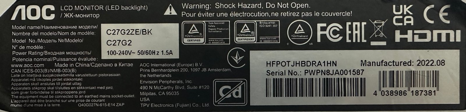 Placa de baza 715G9500-MOA-B08-0H5K – AOC C27G2ZE/BK